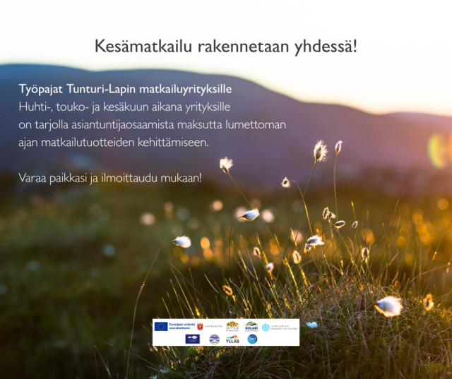 Kevään ja syksyn 2026 aikana pääsemme Nordic Marketing Oy:n johdolla kehittämään Tunturi-Lapin lumettoman ajan matkailutuotteita. Kevään työpajojen vetäjinä toimivat Anu Nylund ja Anne Kalliomäki.