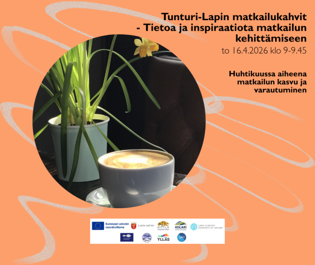Tunturi-Lapin matkailukahvit – 45 minuuttia ajankohtaista tietoa ja inspiraatiota matkailun kehittämiseen. Kuukauden välein kokoontuvat verkkoaamukahvit tarjoavat sinulle tiiviin paketin asiantuntijanäkökulmia ja yrittäjäkokemuksia kiinnostavista teemoista. Lyhyet puheenvuorot, käytännön vinkit ja keskustelu auttavat sinua kehittämään ympärivuotista matkailua ja tuotteita kestävän tulevaisuuden ehdoilla. Tule mukaan keskustelemaan ja verkostoitumaan – helposti, verkossa ja kahvikupin äärellä.